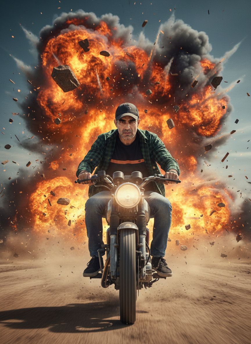 Prompt: "Ultra-realistic cinematic action scene of a man from attached photo riding a classic retro motorcycle straight toward the camera on a dusty open ground. He is wearing a dark backward cap, black t-shirt with an orange stripe, open green checkered shirt, blue jeans, and black sneakers. His expression is intense and focused, eyes forward, gripping the handlebars firmly.