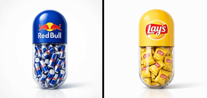 Create a minimal poster. A large capsule pill centered in the frame. The top half of the pill is solid colored and features the [BRAND] logo clearly printed on it. The bottom half of the pill is transparent glass. Inside the transparent part of the capsule, fill it with a large amount of [OBJECT] related to the brand. Ultra clean white studio background, soft shadows, high-end product photography lighting, glossy realistic materials, highly detailed, minimal design, centered composition, modern advertising style. 1080x1080 dimension.3 - Trending AI Tools