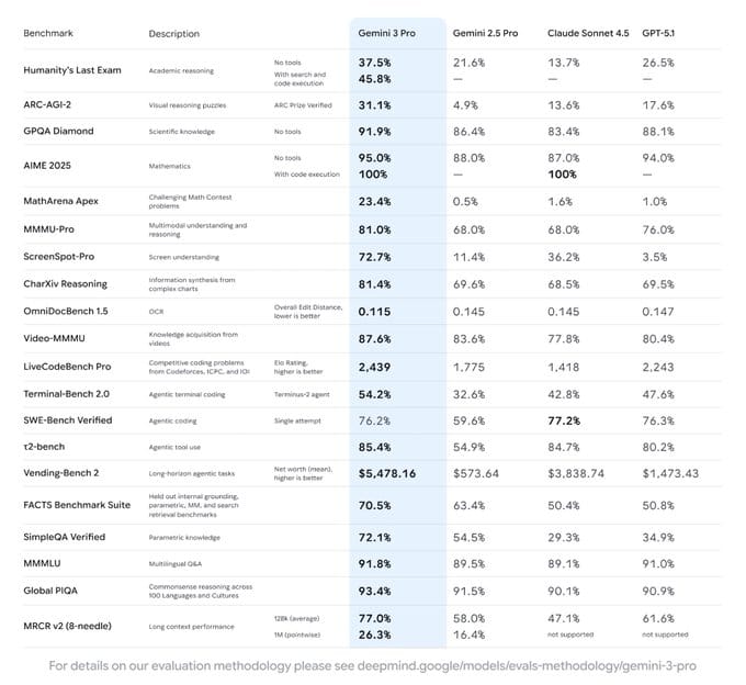 1 - Multimodal reasoning: Gemini 3 outperforms leading AI models across every major benchmark (except coding). It also processes information seamlessly across text, images, video, audio, and code.