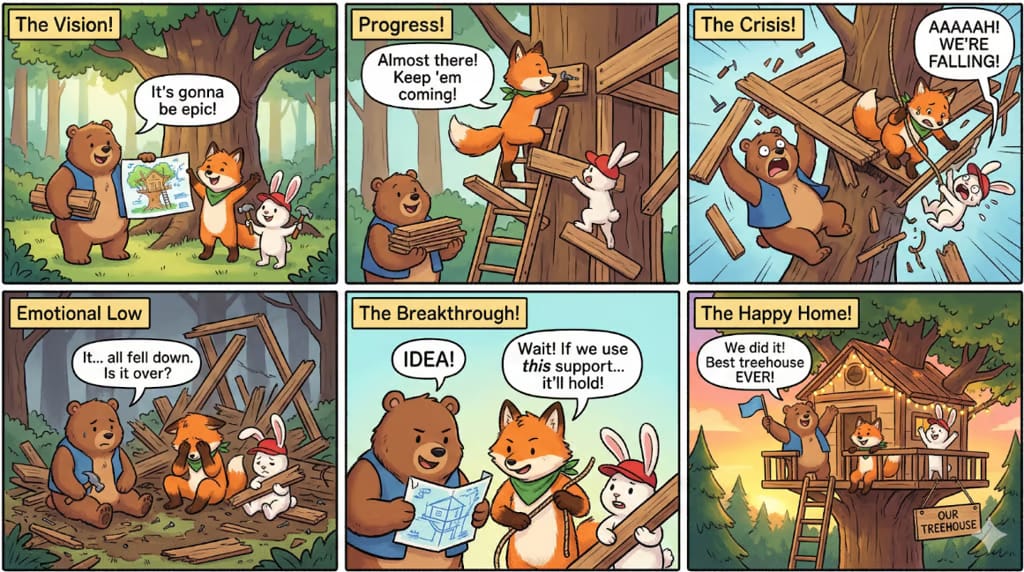 Create a funny 6-panel story with 3 fluffy animal friends building a treehouse together. The story is thrilling, with emotional highs and lows, ending on a happy moment. Keep each character’s identity and clothing consistent across all 6 scenes, but vary their expressions and camera angles.
