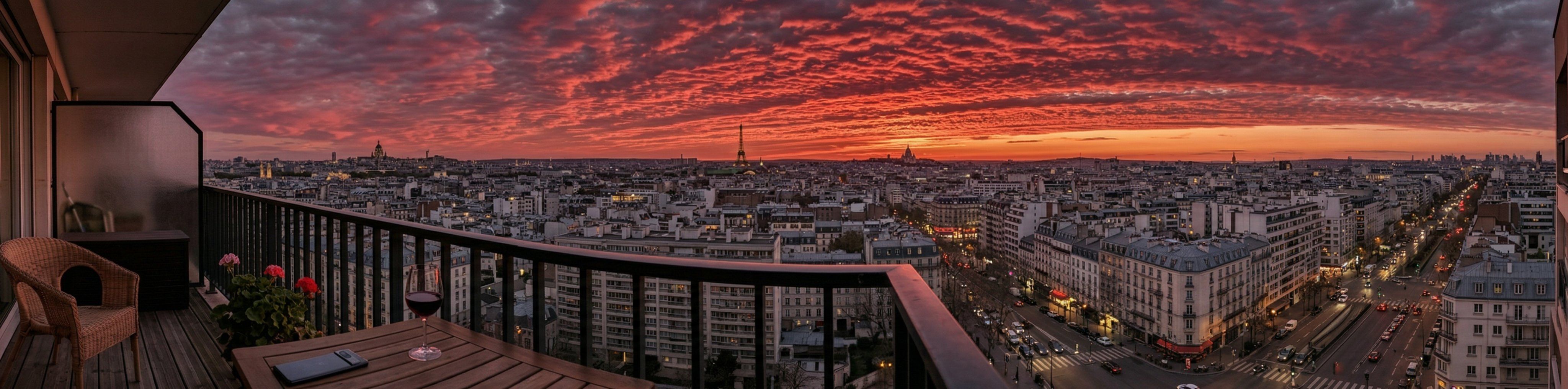 a - A 4:1 panoramic photo I took on my phone, showing the view from my apartment, when the sunset looked perfect with rows of deep red cirrocumulus