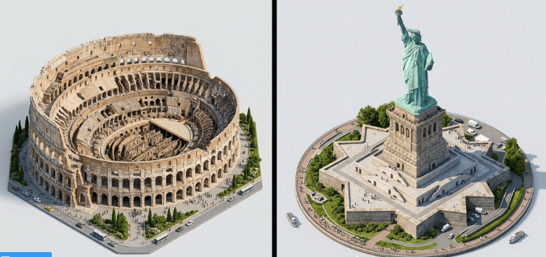 b - "Create a highly detailed isometric 3D rendering of [LANDMARK] in architectural visualization style. The building is shown at a 45-degree angle from above, displaying three visible sides with intricate architectural detail. Photorealistic textures showing materials like stone, glass, metal, or brick. Include the base/ground level with tiny people, cars, and landscaping for scale. Clean white or light grey background. Professional architectural rendering with soft ambient shadows beneath the structure. Every window, column, ornamental detail, and structural element clearly visible. 1080x1080 dimension, centered composition. Style similar to video game building assets or architectural presentation models - clean, detailed, slightly stylized but realistic."