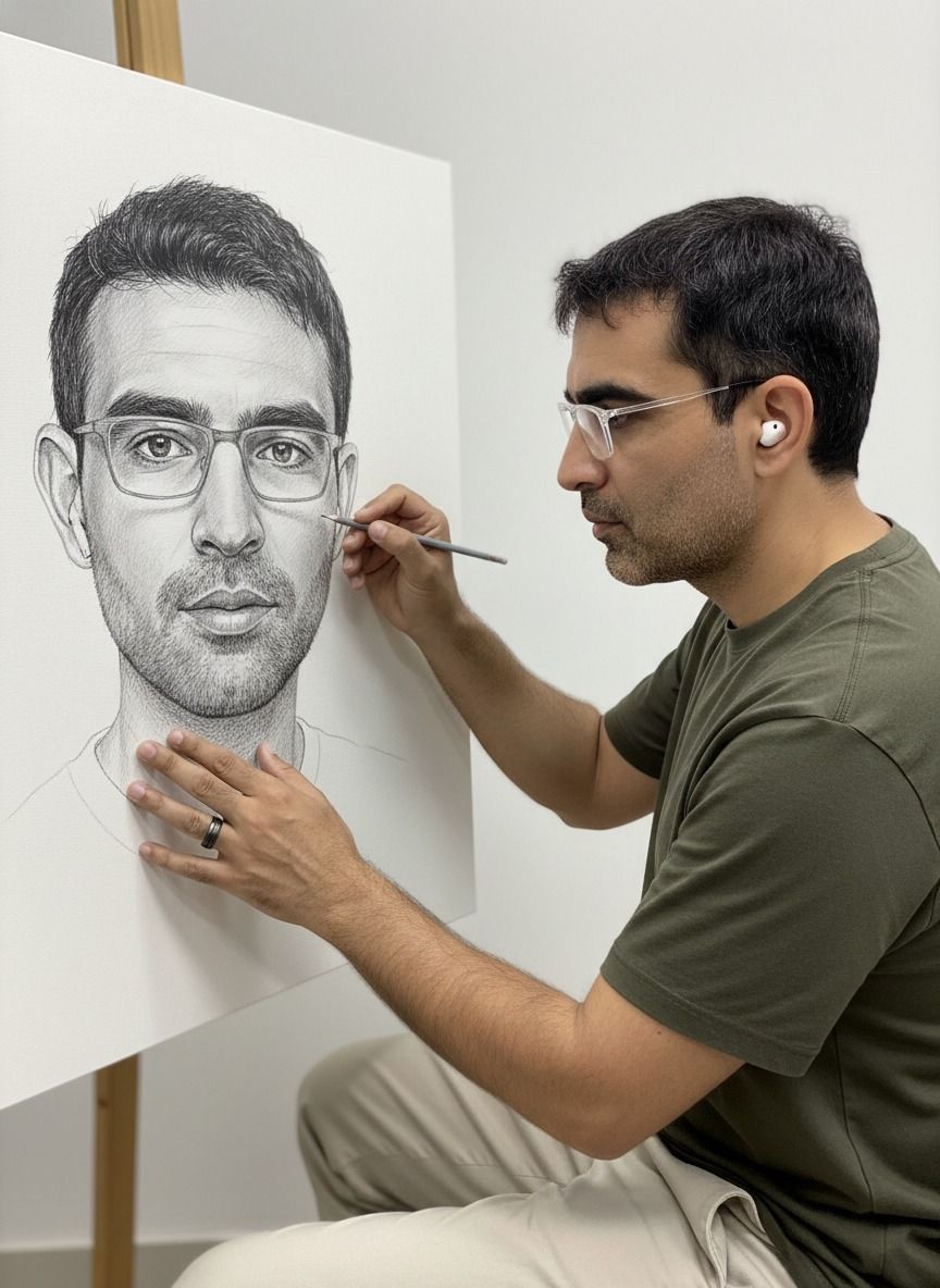 The subject is the same person from the provided reference image, seated or standing in front of a large white canvas, actively drawing a realistic self-portrait of himself. The person is mid-action, holding a pencil or fine pen, focused and calm, with natural posture and believable hand positioning.