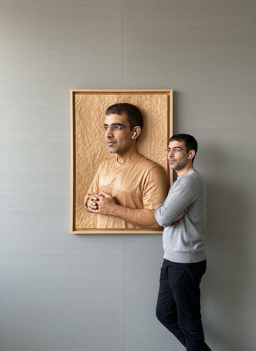 "visual_twist": "The real man and the wooden relief visually merge, as if they are two material versions of the same being."